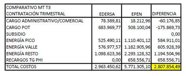 En este caso, la tarifa es, a igual consumo, un 95% mas cara en Neuquén que en Rio Negro. El cuadro destaca que el total de costos en Neuquén asciende a poco más de 5,77 millones contra poco más de 2,89 millones para los productores de Río Negro tomados en esta categoría.