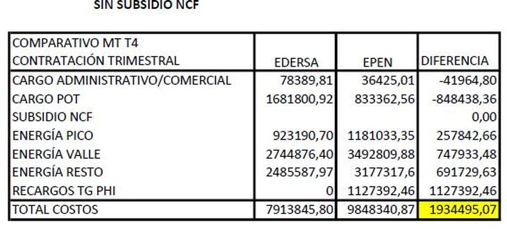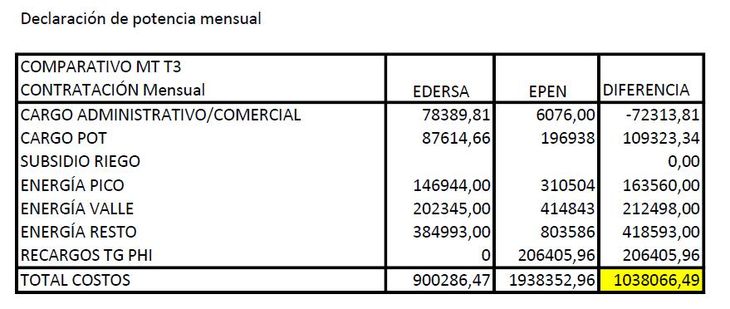 El estudio señala sobre el final de sus párrafos, y como concepto de cierre, que en este caso, las tarifas de Neuquén, a igual consumo es un 19% más cara que en Rio Negro. Si bien se perjudican todas las empresas productoras de EPEN respecto de igual consumo en EDERSA, se afecta mucho más a las estructuras de riego y los pequeños establecimientos productivos que existen en la provincia.