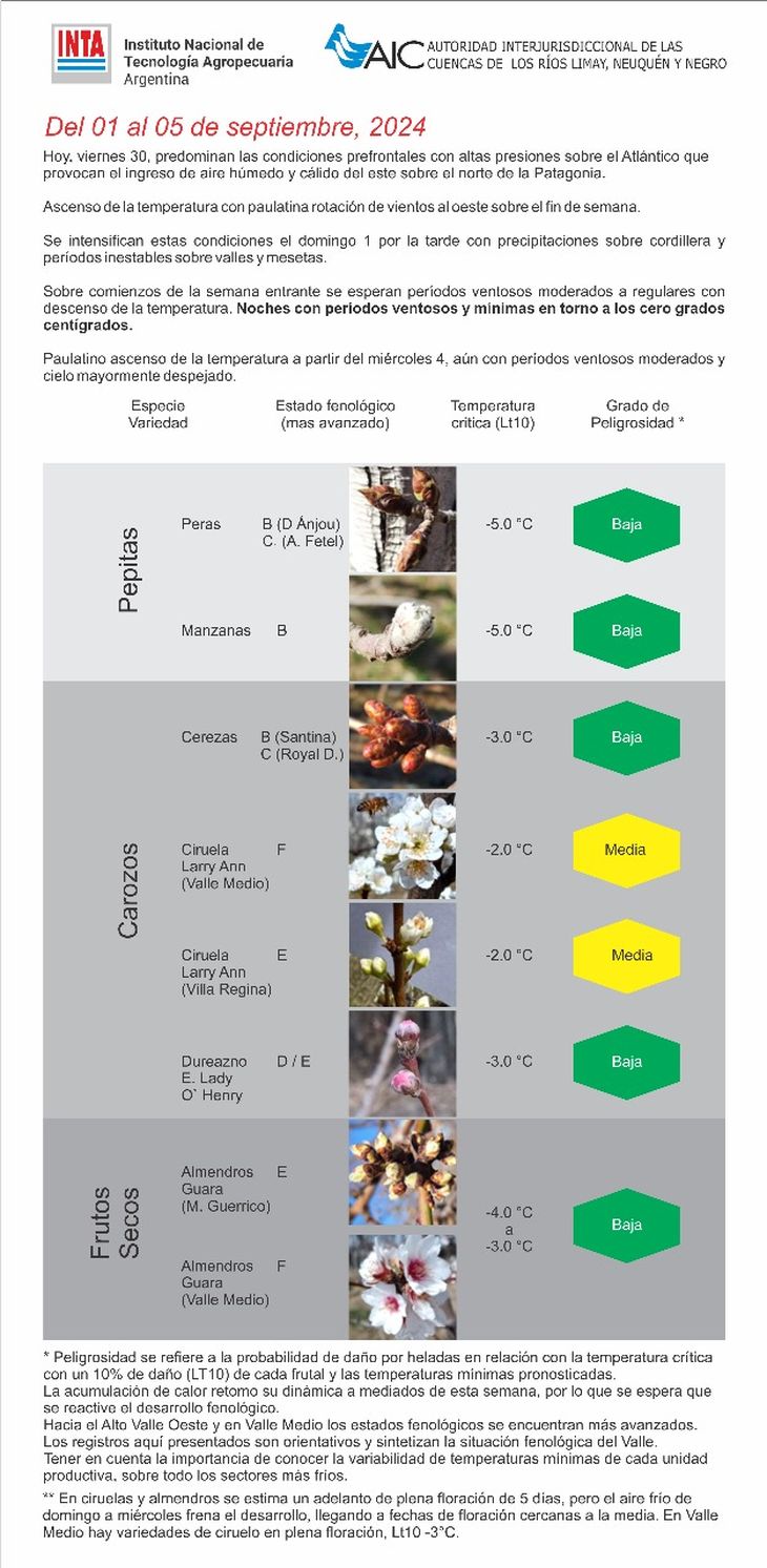 Tal como lo dio a conocer en su último informe de anoche la Autoridad Interjurisdiccional de Cuencas (AIC) junto con el Instituto Nacional de Tecnología Agropecuaria (INTA) en Alto Valle y Valle Medio se esperaban probables enfriamientos sobre la noche del miércoles 4 de septiembre con paulatino avance de la nubosidad, desde el sudoeste, sobre la madrugada de hoy jueves. Anticiparon también que hacia la costa, altas presiones con cielo despejado y con vientos débiles del noreste que se intensifican hacia primeras horas de la mañana.