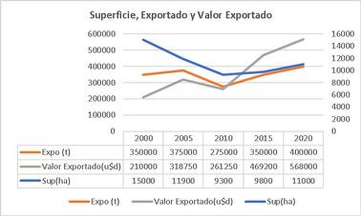 A partir del año 2007 incrementaron la plantación de nuevas variedades de manzanas hasta representar en la actualidad más del 45% del total del área plantada. En el siguiente gráfico se aprecia que, a pesar de disminuir la superficie plantada, la proporción exportada y los ingresos obtenidos se han incrementado.