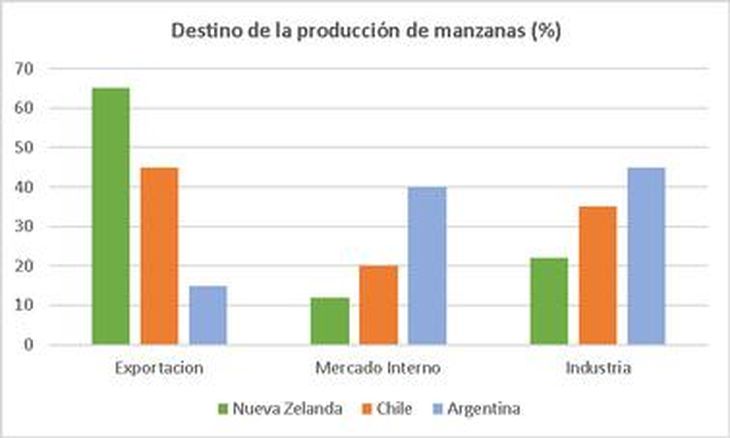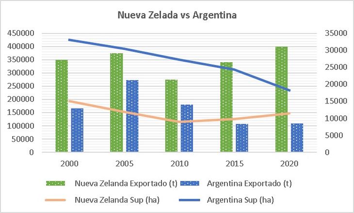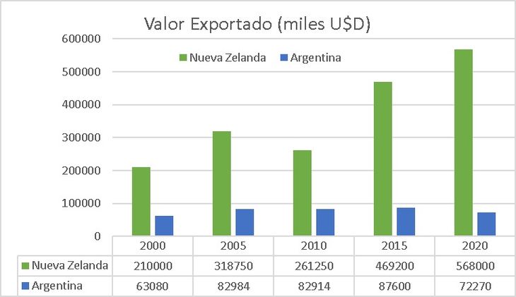 Nueva Zelanda en años normales exporta aproximadamente el 65% de su producción contra Argentina que exporta los últimos años 15 al 18% y Chile el 50%
