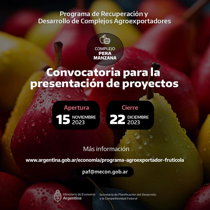 La convocatoria tiene cierre el 22 de diciembre próximo. Más información: https://www.argentina.gob.ar/economia/planificacion-del-desarrollo-y-la-competitividad-federal/programa-agroexportador-fruticola