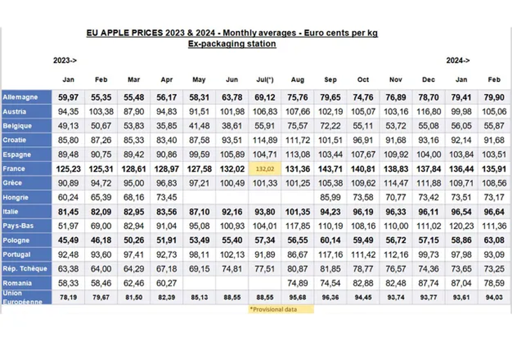 Los precios mensuales medios de la manzana, a la salida de cámara, fueron de 1,359 € por kilo para Francia, 0,799 € para Alemania, 1,035 € para España y 0,931 € para Portugal.