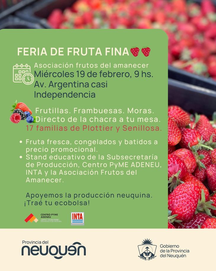 Hoy, a partir de las 9 horas, la Asociación Frutos del Amanecer llevará a cabo una jornada de comercialización de fruta fina en el centro de Neuquén, en Av. Argentina, casi Independencia. La iniciativa reúne a 17 familias productoras de las localidades de Plottier y Senillosa, quienes ofrecerán frutillas, frambuesas y moras directamente desde sus chacras. Además de la venta de fruta fresca, el evento incluirá un espacio educativo coordinado por organismos técnicos que asisten a los productores. Este sector permitirá conocer más sobre los cultivos y los beneficios de la producción de fruta fina en la región.