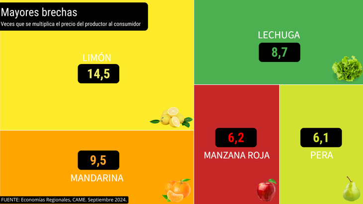En el segmento de frutas, el limón y la mandarina fueron las dos especies por las que el productor percibió un menor valor respecto a los precios finales logrados en góndola, seguidos por las manzanas y peras de la región.