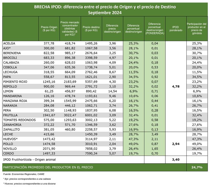 En el mes de septiembre, por los 24 agroalimentos que componen la canasta IPOD, el consumidor pagó 3,4 veces más de lo que recibió el productor en la tranquera del campo. Esto quiere decir que por cada peso ($ 1) que recibió el productor (origen), el consumidor pagó un promedio sobre los 24 productos bajo análisis, de 3,4 pesos en góndola (destino).