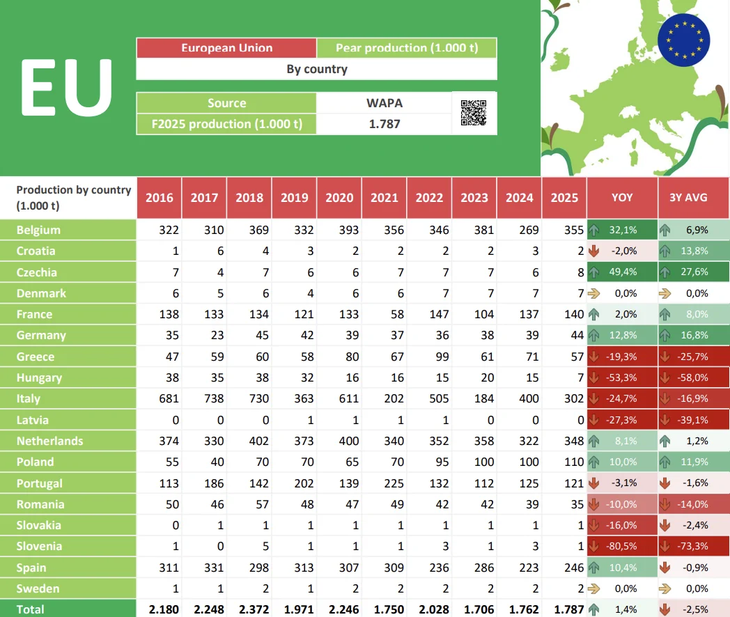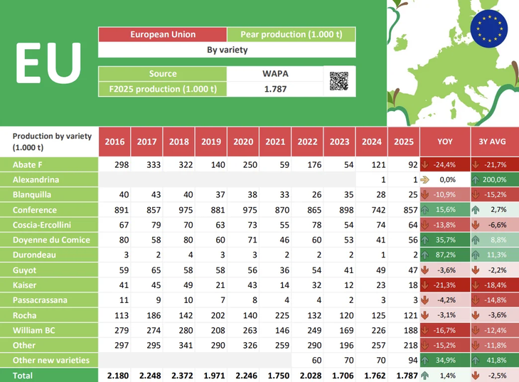 Las primeras estadísticas anticipan buenas posibilidades de colocación para las peras del hemisferio sur -tal como ocurrió en la campaña 2024/2025- teniendo en cuenta que no habrá una sobre oferta de producción local. Pero el dato a tener en cuenta es el crecimiento que registró la cosecha de la variedad Conference, que es una pera que está los doce meses del año presente en las góndolas del viejo continente y compite en forma directa con la pera que llega del hemisferio sur.