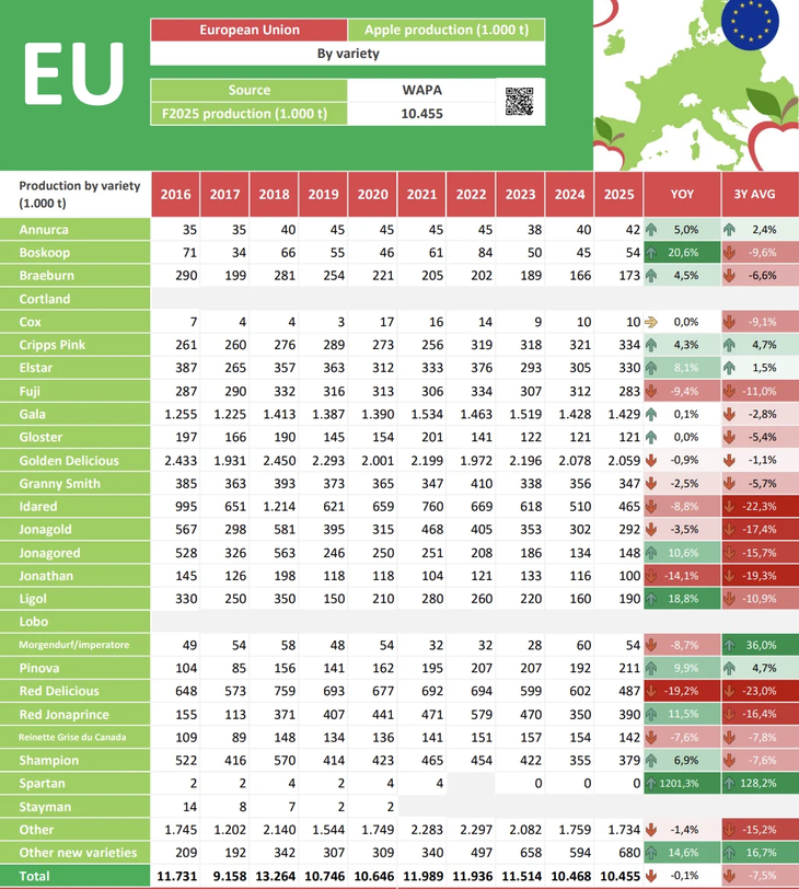 En cuanto a las variedades más cultivadas, la Golden Delicious, histórica favorita del consumidor europeo, se mantiene relativamente estable con una leve baja del 0,9 %, alcanzando una producción de 2,06 millones de toneladas. La Gala, otra variedad muy presente en los supermercados del continente, se estabiliza en torno a 1,43 millones de toneladas.