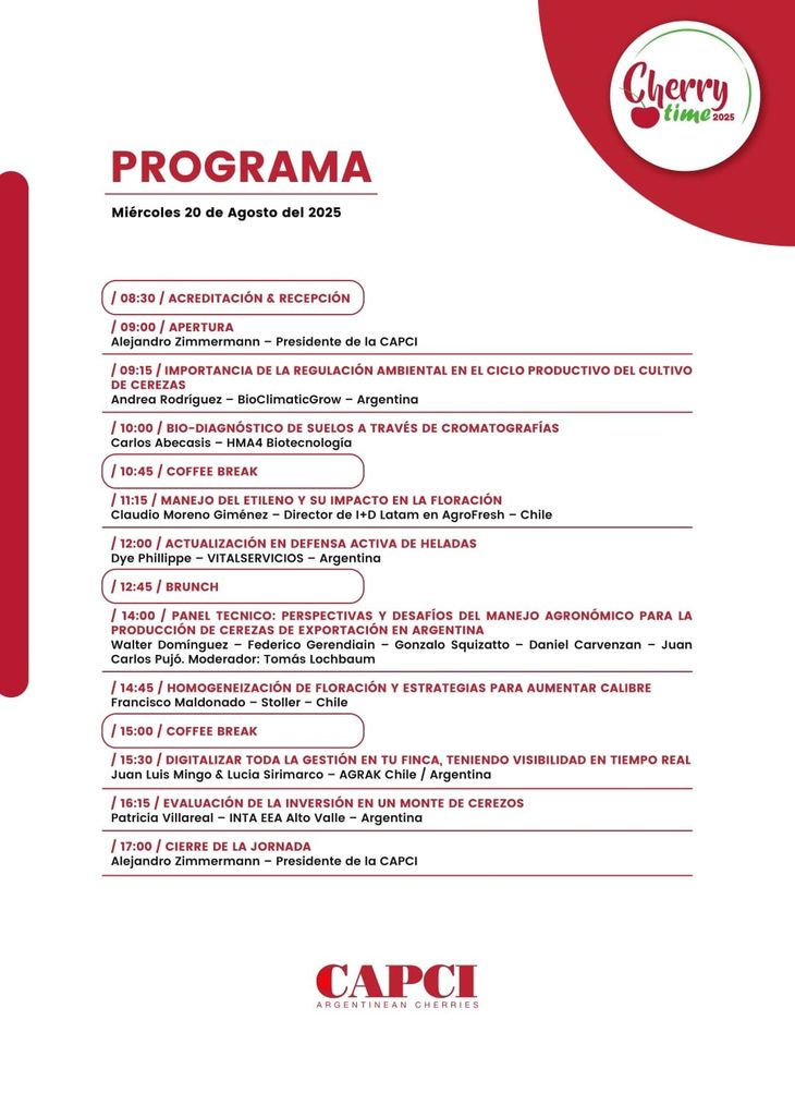 Entre los speakers internacionales que van a estar presentes en el evento se destacan Claudio Moreno Giménez, de Agrofresh; y Francisco Maldonado, de Stoller, ambos provenientes de Chile. También participarán varios especialistas locales que expondrán distintos temas de actualidad por los que está atravesando la industria de cerezas.