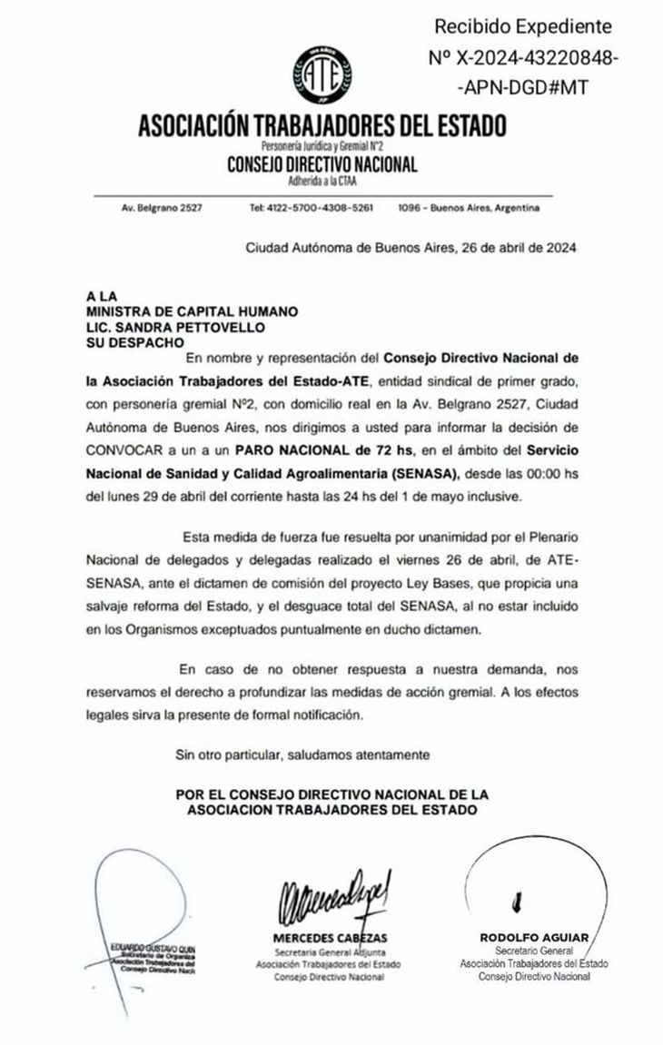 La Asociación Trabajadores del Estado (ATE) realizará un paro de 72 horas en el Servicio Nacional de Sanidad y Calidad Agroalimentaria (SENASA) a partir de las 00 horas del lunes y se paralizarán las exportaciones y controles sanitarios en todo el país. “Este paro seguramente acarreará pérdidas multimillonarias para nuestro país y el Gobierno es el único responsable. Si se aprueba la Ley Bases, el Estado será destrozado”, aseguró Rodolfo Aguiar, Secretario General del sindicato. La medida afectaría a las exportaciones de peras y manzanas que, en este momento, están en sus picos de embarques al exterior.