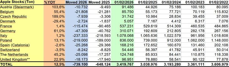 De acuerdo con el informe de WAPA, las existencias totales de manzanas en Europa alcanzaban las 3,4 millones de toneladas al inicio de febrero de 2026. Esta cifra representa un incremento del 12,5% frente a las poco más de 3 millones de toneladas registradas en el mismo corte estadístico de 2025. Este incremento de los stocks sin dudas están generando presión en el mercado y a los precios que está pagando el consumidor. Tal como lo reflejan distintos informes, el precio de la manzana está mostrando un retroceso promedio del orden del 10%.