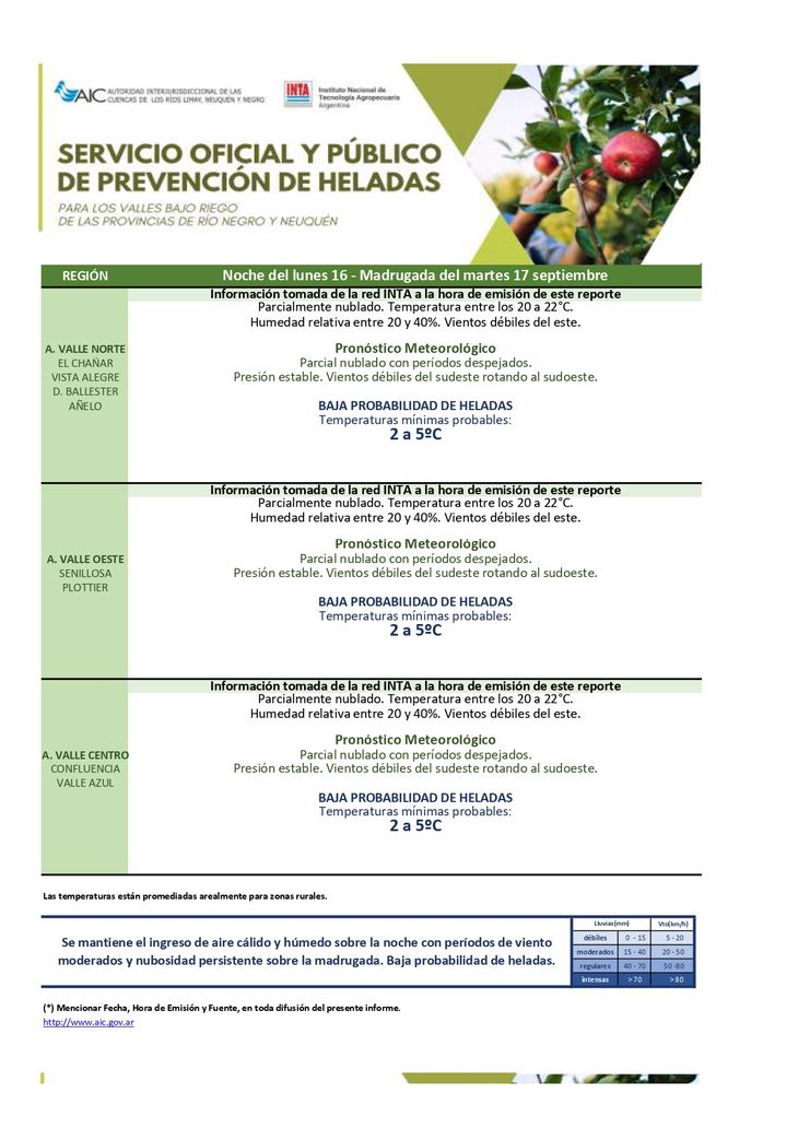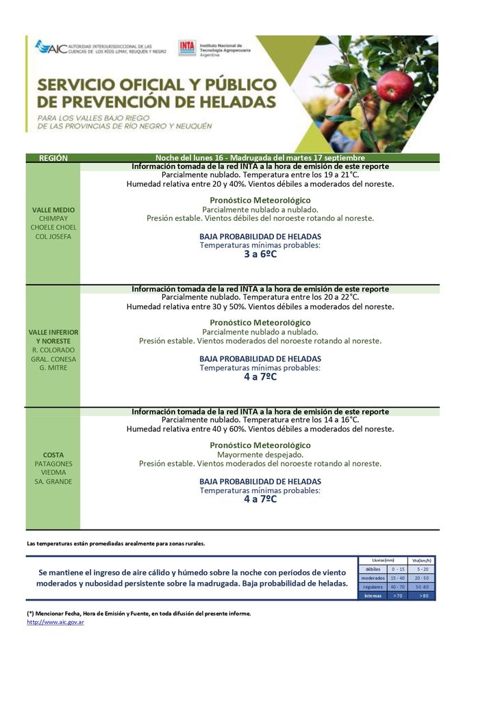 Tal lo señaló anoche la AIC y el INTA en su tradicional pronóstico de heladas, la noche del lunes 16 de septiembre tuvo ingreso de aire cálido y húmedo con períodos de viento moderados y nubosidad persistente sobre la madrugada del martes 17. Hubo baja probabilidad de heladas. Las temperaturas mínimas medias se ubicaron arriba de los 4°C.