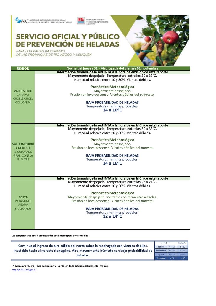 El pronóstico de heladas presentado anoche por la AIC y el INTA detallaba que continuaba el ingreso de aire cálido del norte sobre la madrugada con vientos débiles. Inestable hacia el noreste rionegrino. Aire mayormente húmedo con baja probabilidad de heladas.