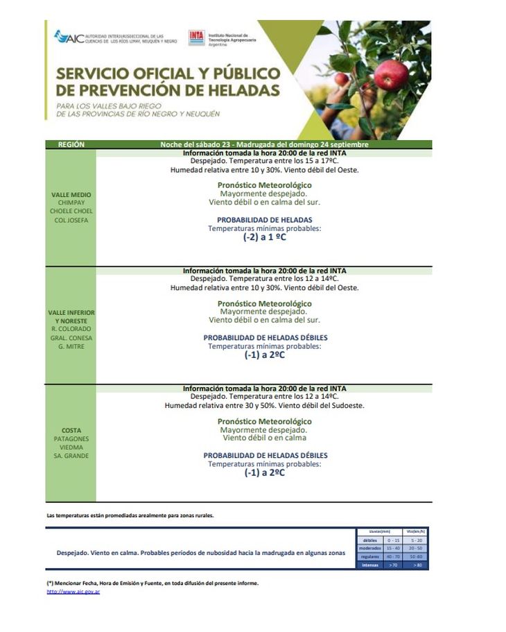En algunos sectores del Alto Valle se registraron estas temperaturas. Esta podrían afectar las plantaciones de carozos y algunas variedades de peras. En la noche del sábado 23 y madrugada del domingo 24, se pronosticó: despejado. Viento en calma. La recomendación fue tener especial atención a la fruta de carozo en los lugares más fríos de la región y de cada chacra.