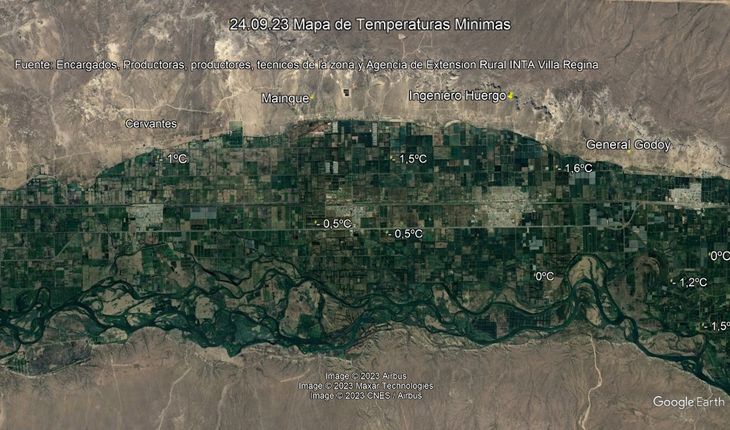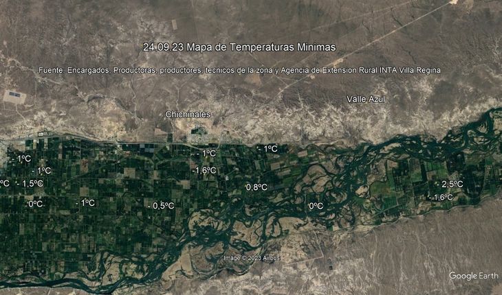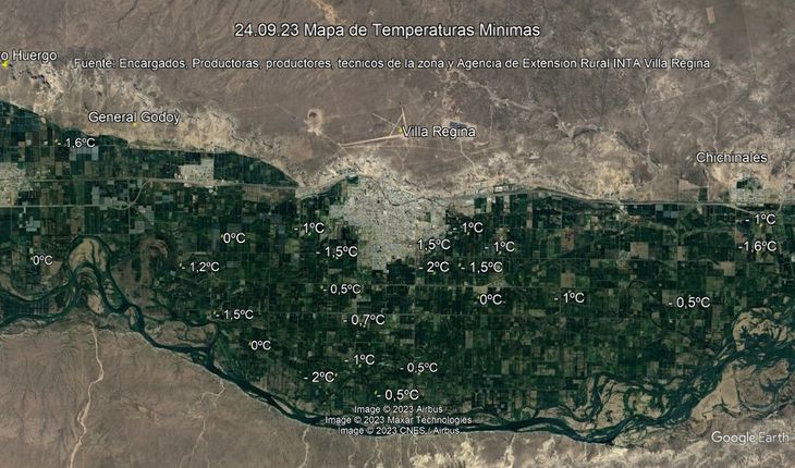 Por otra parte el Ing. Sergio Ziaurriz, de la Agencia de Extensión Rural Villa Regina del INTA, acercó los mapas con las temperaturas en algunos puntos de la zona. En su informe asegura que las mínimas de anoche fueron variables desde 0°C hasta - 2,5°C. "Las temperaturas durante la noche fueron oscilando desde la medianoche entre -1°C, 0°C y 1°C hasta las 5:00 aproximadamente por brisas de intensidad intermitente y direcciones variables. A partir de las 4: 00 y 5:00 se sumo fina nubosidad alta y levantó la temperatura hasta la salida del sol en varias chacras aunque en algunas siguió disminuyendo la temperatura lentamente. Comentarios de Ing. Adriano Pugliese y registro de productores.