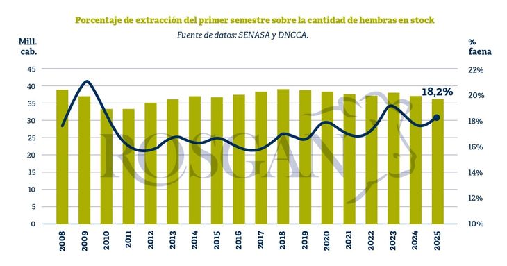 Ahora bien, ¿Qué representa este número en relación con la cantidad de vientres en stock? La faena del primer semestre de 2025 equivale al 18,2 % del stock de vientres registrado al 31 de diciembre de 2024. En tanto, un año atrás, este mismo indicador se ubicaba en 17,7 %, y en 2023 alcanzaba el 19,2 %.