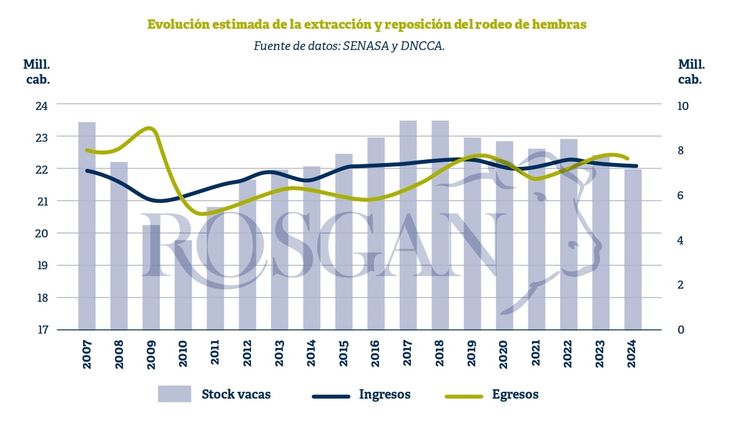 Tomando como ejemplo el último año, 2024, el ingreso de hembras al stock fue de 7,31 millones de cabezas, dato que surge del recuento de terneras al 31 de diciembre de ese año. Durante ese mismo período, los egresos del circuito productivo totalizaron 6,65 millones de cabezas, cifra explicada por la faena de vacas y vaquillonas informada entre enero y diciembre de 2024.