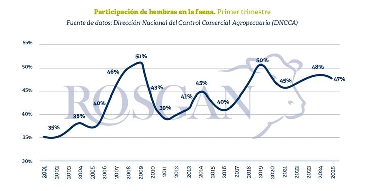 En efecto, a excepción del año 2021 —cuando se registró forzosamente una caída en esta participación debido a las restricciones impuestas a la exportación—, desde 2019 hasta la fecha la faena de hembras ha oscilado entre el 47% y el 50% del total, lo que refleja un porcentaje considerable y sostenido.