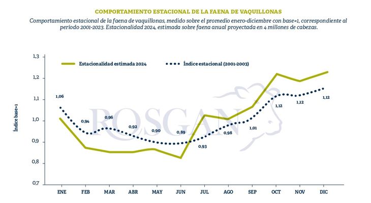 Estacionalmente, la faena de vaquillonas tiende a crecer durante el segundo semestre del año. Al calcular el índice estacional sobre su promedio mensual (enero-diciembre = 1), vemos que la categoría toca su punto máximo en diciembre, con un índice de 1,16 para bajar luego a lo largo de todo el primer semestre y alcanzar un mínimo de 0,89 puntos en junio.