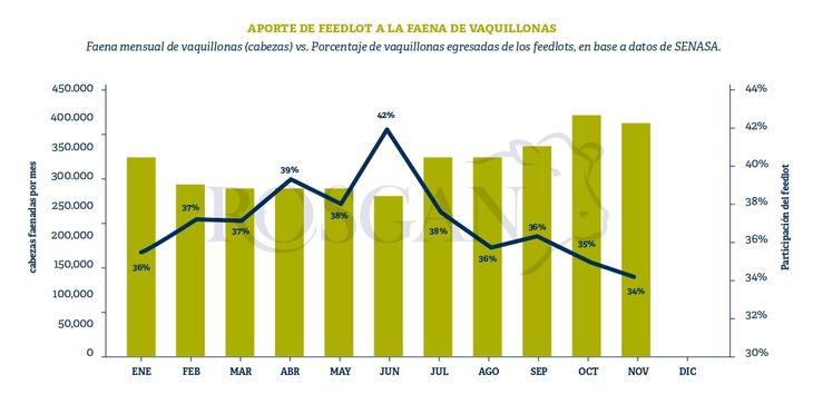 A pesar del elevado nivel de ocupación que mostraron los corrales durante gran parte del año, marcando récords históricos en los últimos seis meses, este aumento en la faena de vaquillonas no está siendo acompañado en igual proporción por mayores egresos de los feedlot. En efecto, el porcentaje que aportan los corrales ha ido disminuyendo en los últimos meses; tras haber alcanzado un pico del 42% en junio actualmente representa apenas un 34% del total de vaquillonas que llegan a faena.