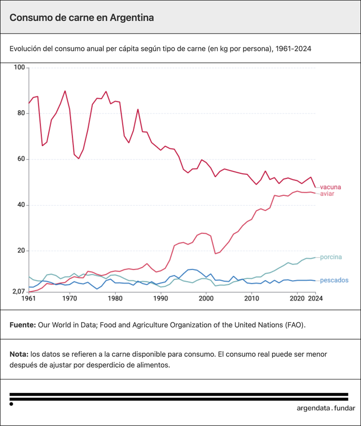 Mientras el consumo de carne aviar y porcina creció significativamente, el de pescado permanece estancado. Entre 1961 y 2022, el aumento del 74% en el consumo de pescado palidece frente al boom de otras proteínas. A fines de los 90, el consumo superó brevemente los 10 kg per cápita por una sobrepesca insostenible, pero retrocedió.
