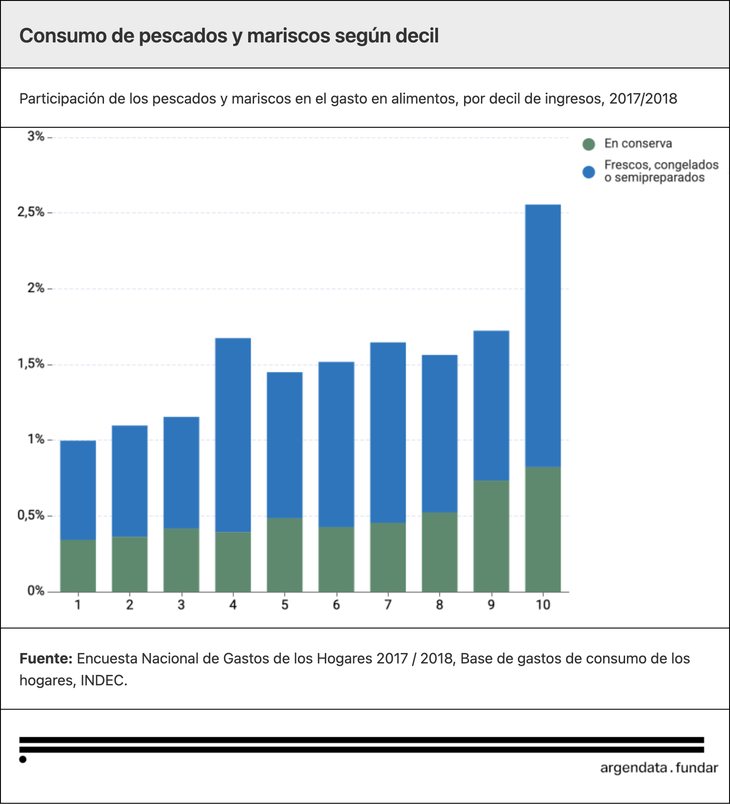 El consumo de pescado refleja una marcada desigualdad socioeconómica. En los hogares de menores ingresos, el gasto en pescado representa solo el 1% del presupuesto alimentario, mientras que en el decil más rico alcanza el 2,5%, según la Encuesta Nacional de Gastos de los Hogares. Mariscos como langostinos y pescados importados (salmón, atún en conserva) predominan en sectores acomodados, mientras la merluza y pescados de río son más accesibles.
