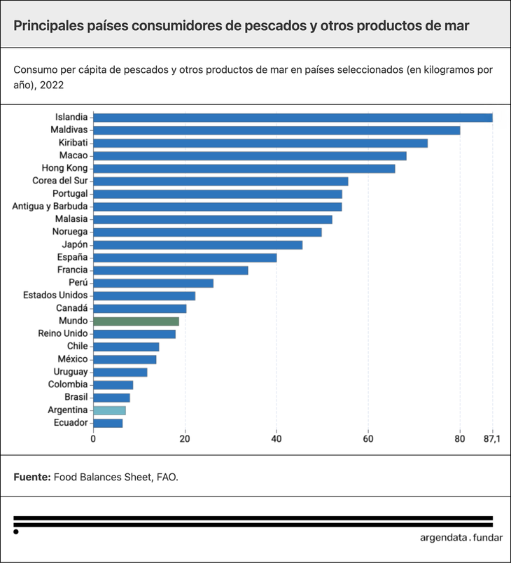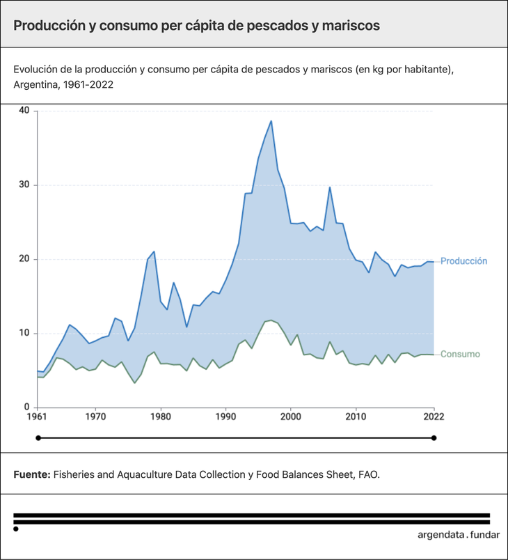 Argentina produce 19,6 kg de pescado per cápita (2022), un aumento del 300% desde los 4,9 kg de 1961. Sin embargo, el consumo interno creció solo de 4,1 kg a 7,1 kg en el mismo período. El excedente, equivalente al 176% de lo consumido, se exporta a mercados como España, China, Estados Unidos e Italia.