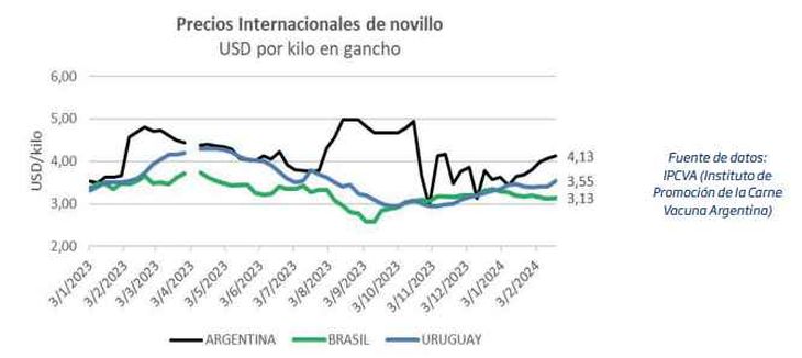 Los valores para el novillo pesado tipo exportación muestran un Brasil sumamente competitivo. Desde el comienzo de año a la fecha, la referencia para el novillo gordo en San Pablo retrocedió un 6% en dólares para ubicarse en torno a los USD 3,13 por kilo en gancho y consolidarse con el valor más bajo de la región, 25% por debajo de lo que se paga por el novillo argentino, actualmente en USD 4,13 el kilo.