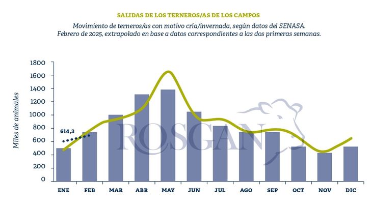 Tras un arranque del año con elevado movimiento de terneros, febrero parece estar transcurriendo con mayor serenidad, conforme el clima se torna más apacible y los valores obligan a reanalizar el momento más adecuado para la venta. En enero, los datos del SENASA mostraban un movimiento de hacienda récord para ese mes, con cerca de 615 mil terneros y terneras saliendo de los campos de cría con destino a otros establecimientos de cría y/o invernada. Esto representaba un aumento del 21% en relación al nivel de traslados registrados en enero de 2024 y el nivel mas elevado desde que el organismo publica estos mismos registros, año 2017.