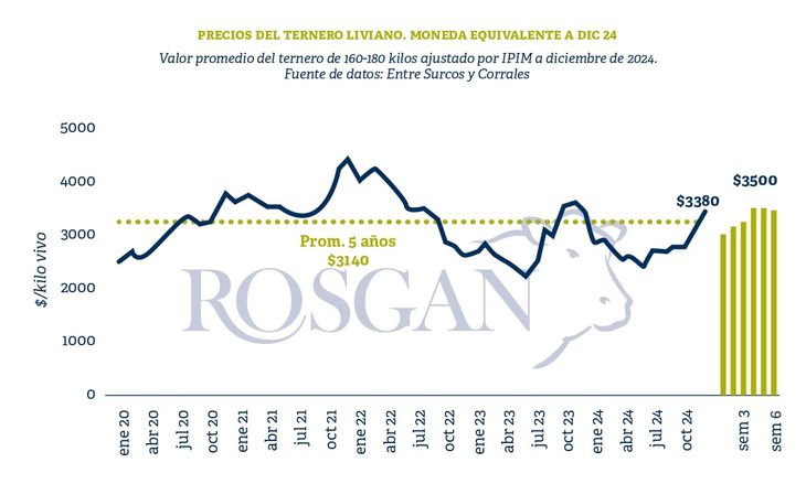 En términos relativos, el valor del ternero liviano de 160 a 180 kilos -el que usualmente se toma como referencia para el seguimiento de la zafra- se encuentra en muy buenos niveles. Comparado con el promedio de los últimos 5 años ($3.140 a valores de diciembre de 2024), hoy un ternero por el que se obtiene -en promedio- unos $3.500 el kilo ofrece un valor 10% superior.