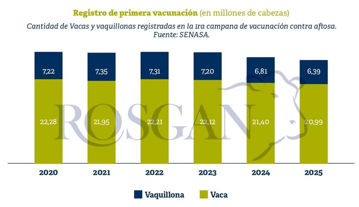 Según las estadísticas publicadas por SENASA, este año se vacunaron contra la fiebre aftosa 49,4 millones de vacunos, frente a los 50,6 millones registrados en la primera campaña de 2024. En términos absolutos, esto representa una pérdida de 1,3 millones de animales en los últimos 12 meses, equivalente a una caída anual del 2,4 %.