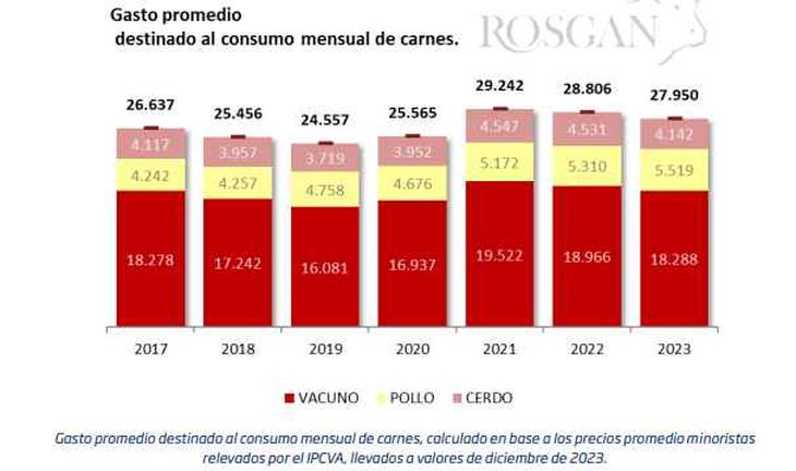 En particular, la carne vacuna, que es la que mayor incidencia tiene en nivel de gasto general al representar el 65% del presupuesto total de compra, en promedio se encuentra un 11% más barata que lo que costaba en 2021, llevado a moneda actual. Claro está que, durante el último año, la abundante oferta de carne que se dio en un contexto de elevada salida de hacienda producto de la sequía y un consumo, tanto interno como externo, sumamente debilitado, contribuyó a mantener los valores de la carne vacuna relativamente estabilizados.