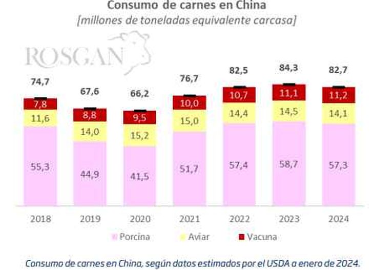 En materia de consumo de carnes, los datos del Departamento de Agricultura de los EE. UU. (USDA) muestran cerca de 2 puntos de caída para este año, marcando el primer retroceso tras la crisis de la Peste Porcina. No obstante, es interesante observar que, aun con caídas esperadas en consumo de carne de cerdo y pollo en torno al 2,5% respecto al año anterior, el consumo de carne vacuna sigue mostrando una tendencia positiva. Según proyecta el USDA, el consumo de carne vacuna este año experimentaría un incremento del 1,6% anual que lo sitúa en torno a los 11,23 millones de toneladas, de las cuales 3,55 millones (32%) provendrían de mercados externos. Si bien el dato resulta apenas ligeramente inferior (-0,7%) al estimado por el organismo para 2023, representa el primer retroceso anual para este mercado.