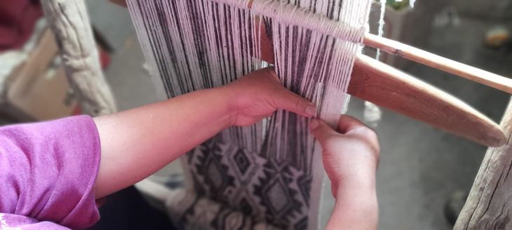 “Mi mamá hacía de todo, tejía, era reservada con su trabajo muy dedicada, no quería que le tocáramos el huso, el telar… Aprendí mirándola”, nos cuenta. “Cuando falleció no me quedaba otra que seguir con eso, yo ya tenía a mi hija mayor. No me costó, ya tenía las ideas en la cabeza”, afirma en relación al tejido en telar.