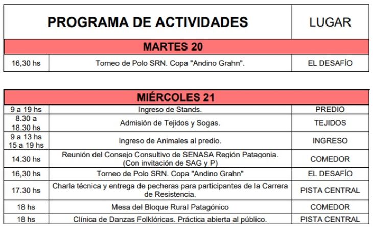 La agenda comenzará mañana miércoles 21 con el ingreso de animales y stands, la realización de la mesa consultiva de SENASA Patagonia y la reunión del Bloque Rural Patagónico. Además, se desarrollará una clínica folclórica y habrá actividades vinculadas al polo, marcando el inicio formal de la muestra.