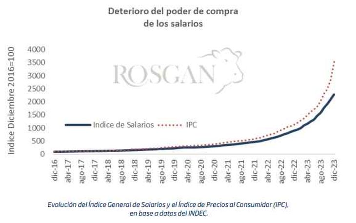 De acuerdo a los últimos datos publicados por el INDEC, el índice general de salarios en Argentina aumentó en 2023 un 152,7% contra un aumento general de precios al consumidor (IPC) que en el mismo período se incrementó en un 211,4% anual, lo que denota un claro deterioro del poder de compra de los consumidores.