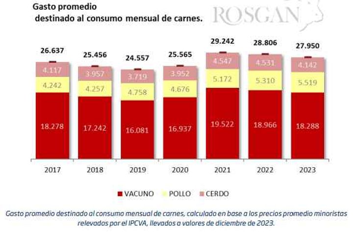 Pero, analizando más detenidamente los números, si medimos el gasto promedio mensual destinado al consumo de carnes en Argentina, descontando la inflación acumulada a diciembre de 2023, vemos que el gasto total, lejos de crecer, en términos reales ha disminuido ligeramente en los últimos tres años.