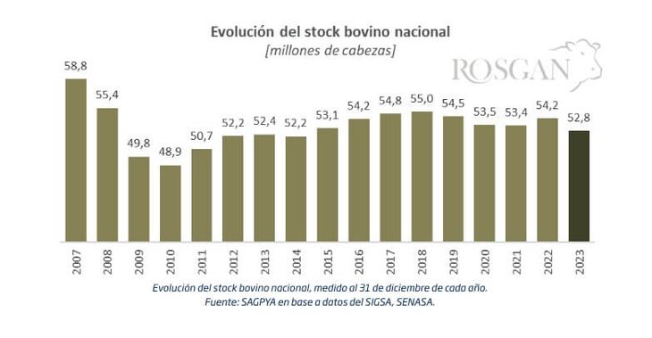 El stock ganadero, al cierre del 2023 se ubicó en las 52,78 millones de cabezas, reflejando una merma interanual del 2,7%.