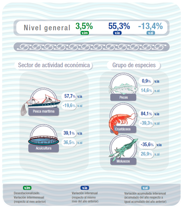 En contraste, los peces solo crecieron un 0,9% interanual (índice 87,2, acumulado 14,6%), con incidencia mínima del 0,3%. Los moluscos cayeron un -35,6% (índice 18,9, acumulado 26,9%), generando una incidencia negativa del -1%.