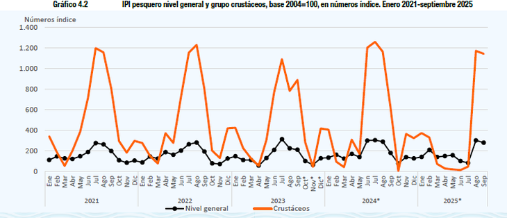 En septiembre 2025, el índice de Producción Pesquero (IPI) sube 55,3% apalancado en el langostino. El acumulado anual cae 13,4%. ¿es sostenible la trepada?