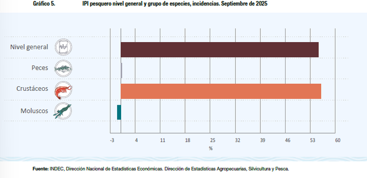 Dentro de los grupos de especies, los crustáceos emergen como el motor del repunte, con un aumento interanual del 84,1% en septiembre de 2025. Este grupo, codificado como 043 en el CPC 2.1, registró un índice de 1.141,8, aunque el acumulado anual refleja una caída del -39,3%. Su incidencia en el nivel general fue positiva en 56%, superando ampliamente a otros segmentos.