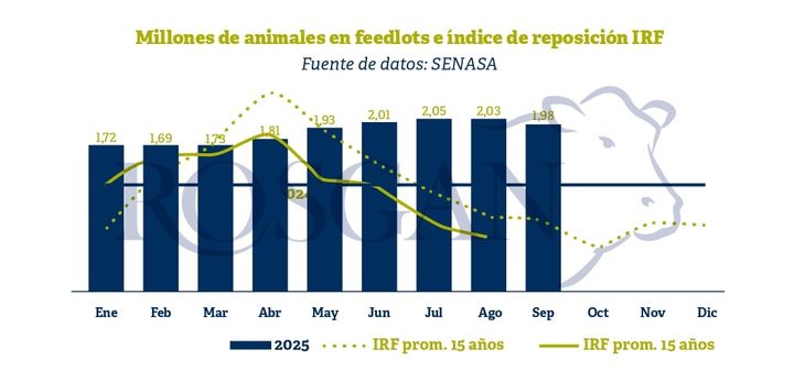 Los últimos datos disponibles, al 1° de septiembre, dan cuenta de un stock en corrales de engorde de 1,98 millones de cabezas. Si bien el número sigue siendo elevado, en el último mes se registró una fuerte caída en el nivel de encierre, con un índice de reposición (ingresos/egresos) de 0,76, el más bajo para ese mes en los últimos 15 años.