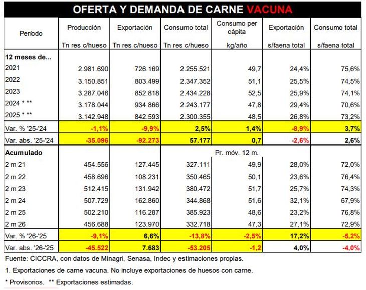 El informe de la Cámara de la Industria y el Comercio de Carnes y Derivados de la República Argentina (CICCRA) confirma que esta caída en el consumo no es un fenómeno aislado, sino el resultado de una menor actividad general del sector. En febrero se faenaron 924.300 cabezas, un 10,7% menos que en el mismo mes del año anterior, mientras que en el acumulado del primer bimestre la retracción alcanzó el 11,1%. Este descenso impactó de manera directa en la producción total de carne, que se ubicó en 457.000 toneladas res con hueso, un 9,1% menos en comparación interanual, equivalente a una reducción de aproximadamente 45.500 toneladas.