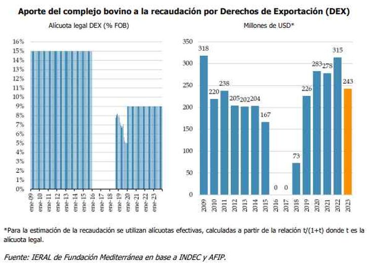 Un informe elaborado por Juan Manuel Garzón y Franco Artusso, del IERAL de la Fundación Mediterránea, da cuenta de que el aporte del complejo de la industria de carne bovina a las arcas del estado Nacional, a través de la recaudación de Derechos de Exportación (DEX-Retenciones), habría estado en el orden de 243 millones de dólares en 2023, un valor que se ubica 72 millones dólares por debajo de 2022 (-23% en términos reales), que se explica por la caída de precios internacionales, dado que los volúmenes exportados fueron más altos y no hubo cambio de alícuotas de DEX.