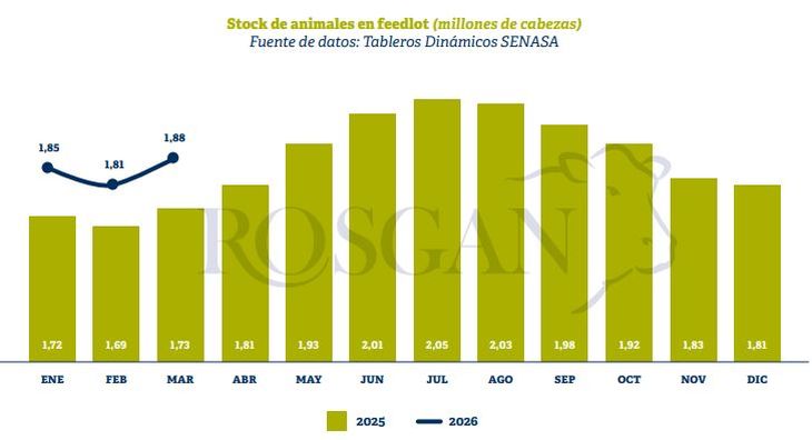 Los números del sector engordador reflejan la alta capacidad de adaptación del feedlot frente al actual escenario productivo. Con existencias récord y un nivel de actividad elevado, los corrales de engorde se consolidan como actores clave en la terminación de animales recriados. Según datos del SENASA, al 1° de marzo los feedlots reportaban 1,88 millones de cabezas, un 9% más que en 2025, cuando se había registrado otro récord histórico de 1,73 millones de cabezas para la misma fecha.