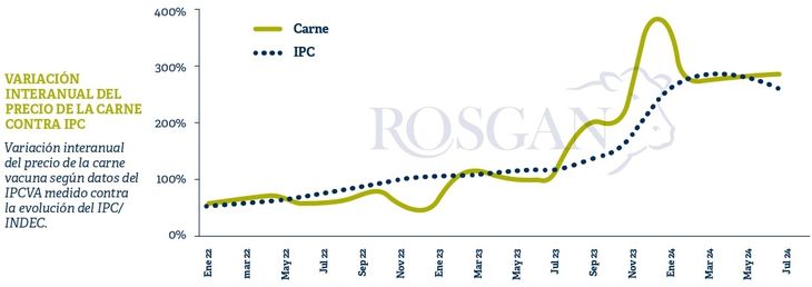 Asimismo, mientras que el IPC en los primeros siete meses del año acumula una suba general del 87,0%, el precio de la carne vacuna varia apenas un 54,3%, registrando un retraso de más de 30 puntos respecto de la inflación.