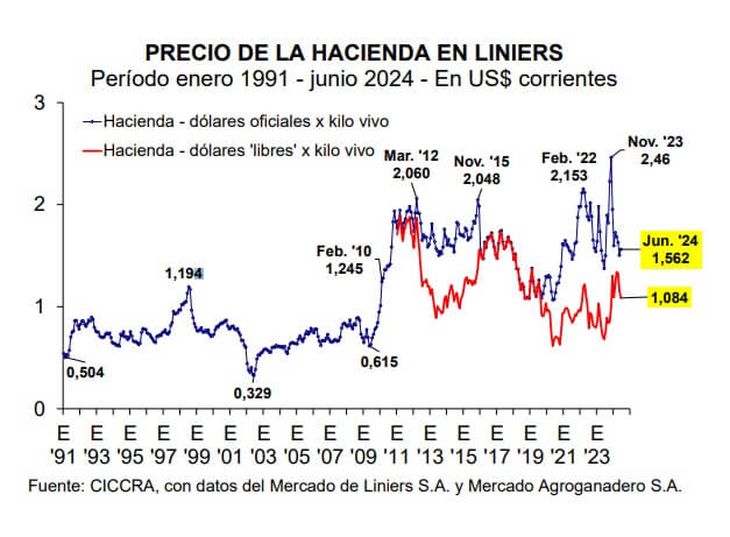 Un reciente estudio de la Cámara de la Industria y Comercio de Carnes y Derivados de la República Argentina (CICCRA) detalla que en junio el precio de la hacienda en pie comercializada en el mercado de Cañuelas (Buenos Aires) recuperó la pérdida que había registrado durante mayo (+5,9%). El promedio mensual se ubicó en $ 1.412,05 por kilo vivo. En tanto, en la comparación interanual la suba llegó a 312,8%. En un contexto de nueva ampliación de la brecha cambiaria, el precio del animal en pie subió en dólares oficiales, pero cayó en dólares ‘libres’.