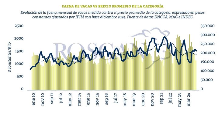 Ahora bien, cuán virtuoso resulta en adelante este circuito de faena de vacas e incluso vaquillonas cuando el valor de lo obtenido viene perdiendo su atractivo comercial tanto para la exportación como -por derrame- para el productor local. En 2024, los precios pagados por China a la industria local cayeron en promedio un 10% interanual, alcanzando niveles más bajos que en plena pandemia. Esta tendencia, redujo sustancialmente la capacidad de compra, trasladando al productor una baja en las cotizaciones del orden del 6% interanual, en pesos constantes, y de más del 20% si lo comparamos con los máximos obtenidos en 2022.