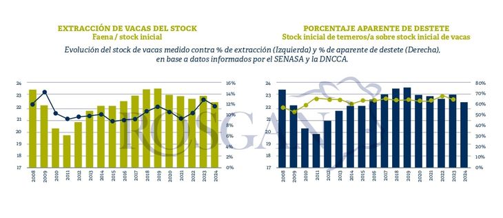 Sin embargo, la contracara a este virtuosismo, comienza a reflejarse cuando -por exceso de extracción– caemos en un estancamiento del stock nacional. Ciclos de fuerte crecimiento en nivel de faena de vacas como los registrados en los años 2018 y 2019, más allá del período 2008/09 afectado naturalmente por una fuerte y prolongada sequía, tal como lo sucedido en 2023, llevaron a alcanzar niveles de extracción sumamente elevados para el perfil de nuestra ganadería, la cual, en términos de índices de destetes venía bastante amesetada.
