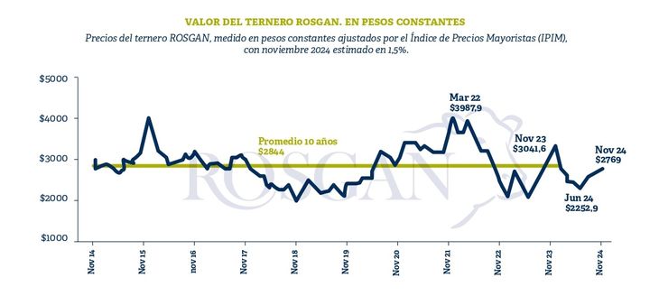 El precio del ternero de invernada, a moneda constante, continúa situándose por debajo de los valores promedio de los últimos 10 años. Si bien, al tomar como indicador el valor Índice Rosgan que para el mes de noviembre marcaba una referencia de $2.769 el kilo se aprecia una mejora real en los últimos meses, este comportamiento no deja de responder en gran medida a la propia estacionalidad de oferta de la categoría sin llegar a reflejar aun la menor disponibilidad estructural de cabezas registrada este año como consecuencia de la seca pasada.
